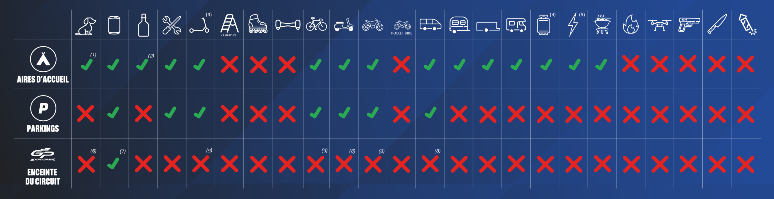 Pour le confort de tous, certains équipements et véhicules ne sont pas autorisés sur le site. Vous trouverez, ci-dessous, un récapitulatif des équipements, objets et véhicules autorisés au sein des différents secteurs : Aires d’accueil, Parking et Enceinte du Circuit.